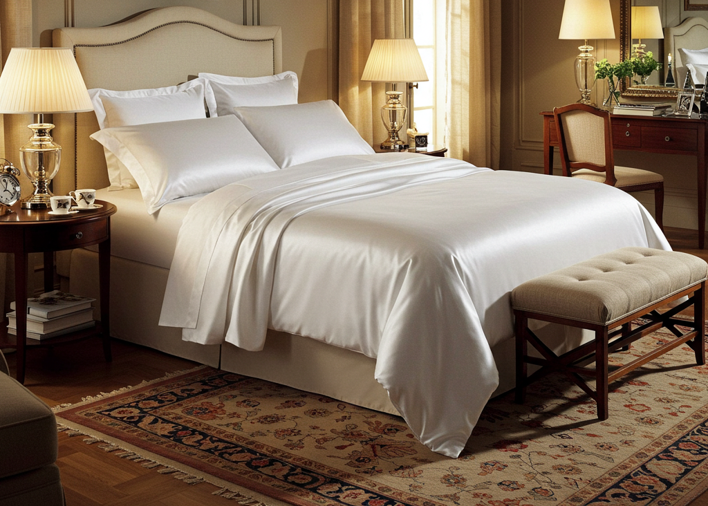 Luxuriöses Bett mit Bettwäsche aus ägyptischer Baumwolle, präsentiert in einem elegant eingerichteten Schlafzimmer, das Komfort und zeitlose Eleganz ausstrahlt.